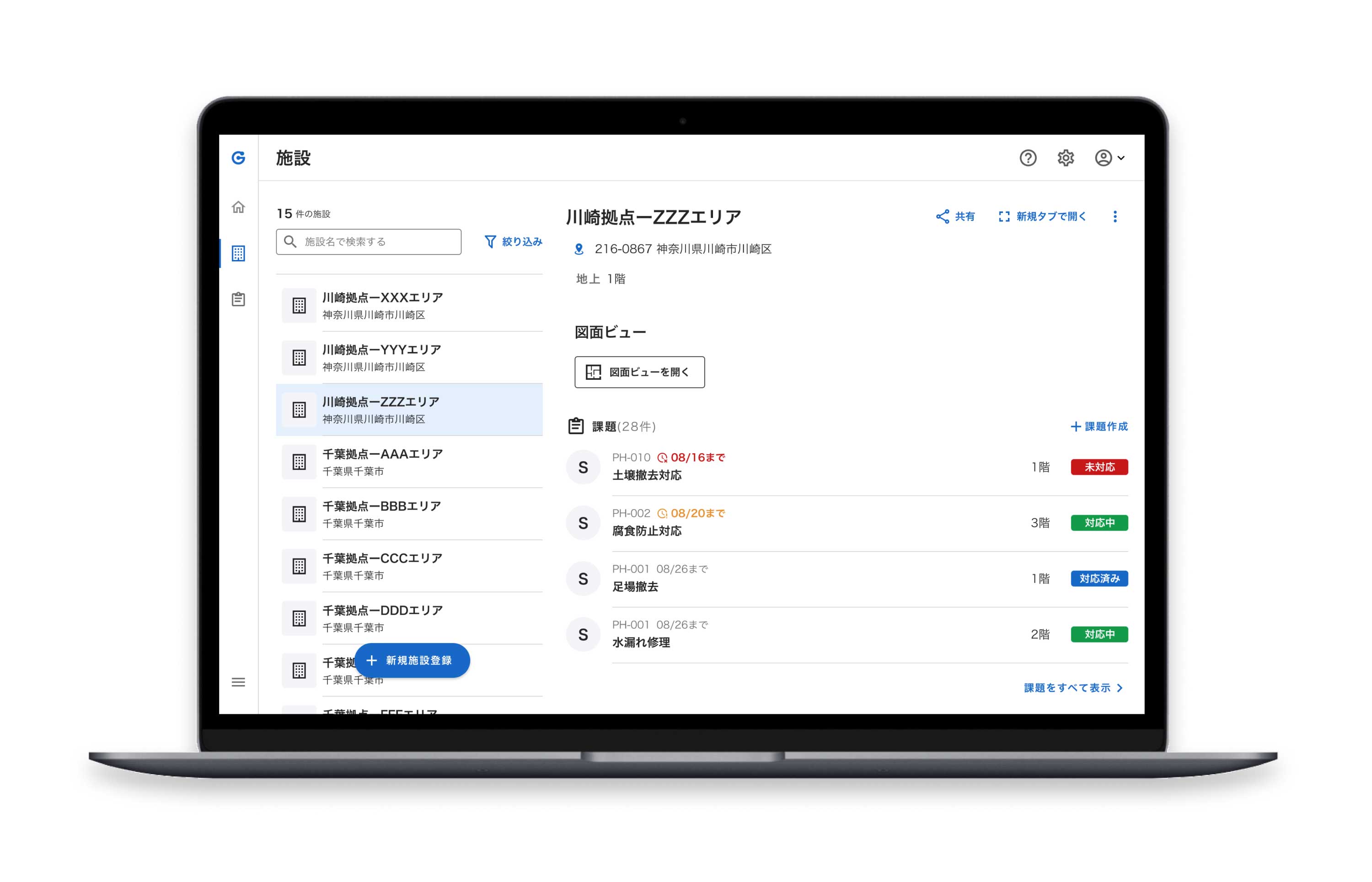 設備情報やトラブル対応状況が図面、