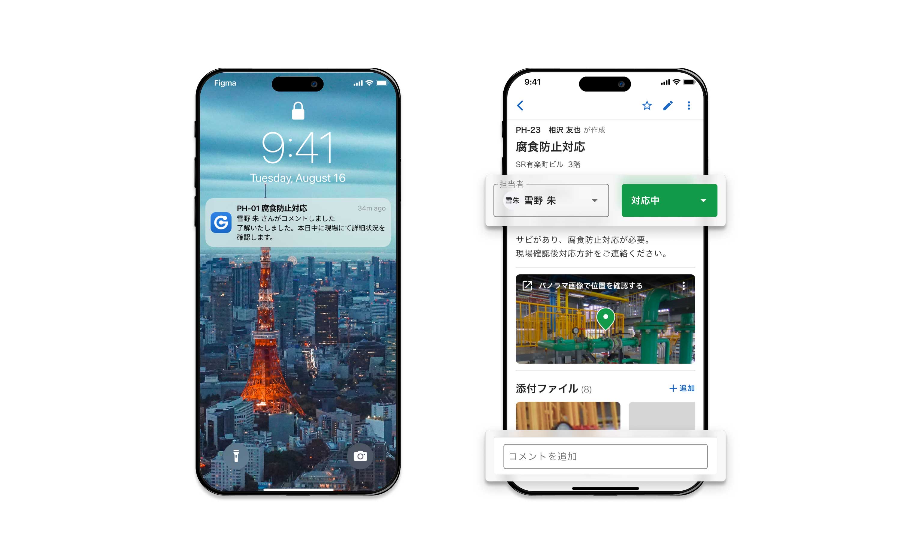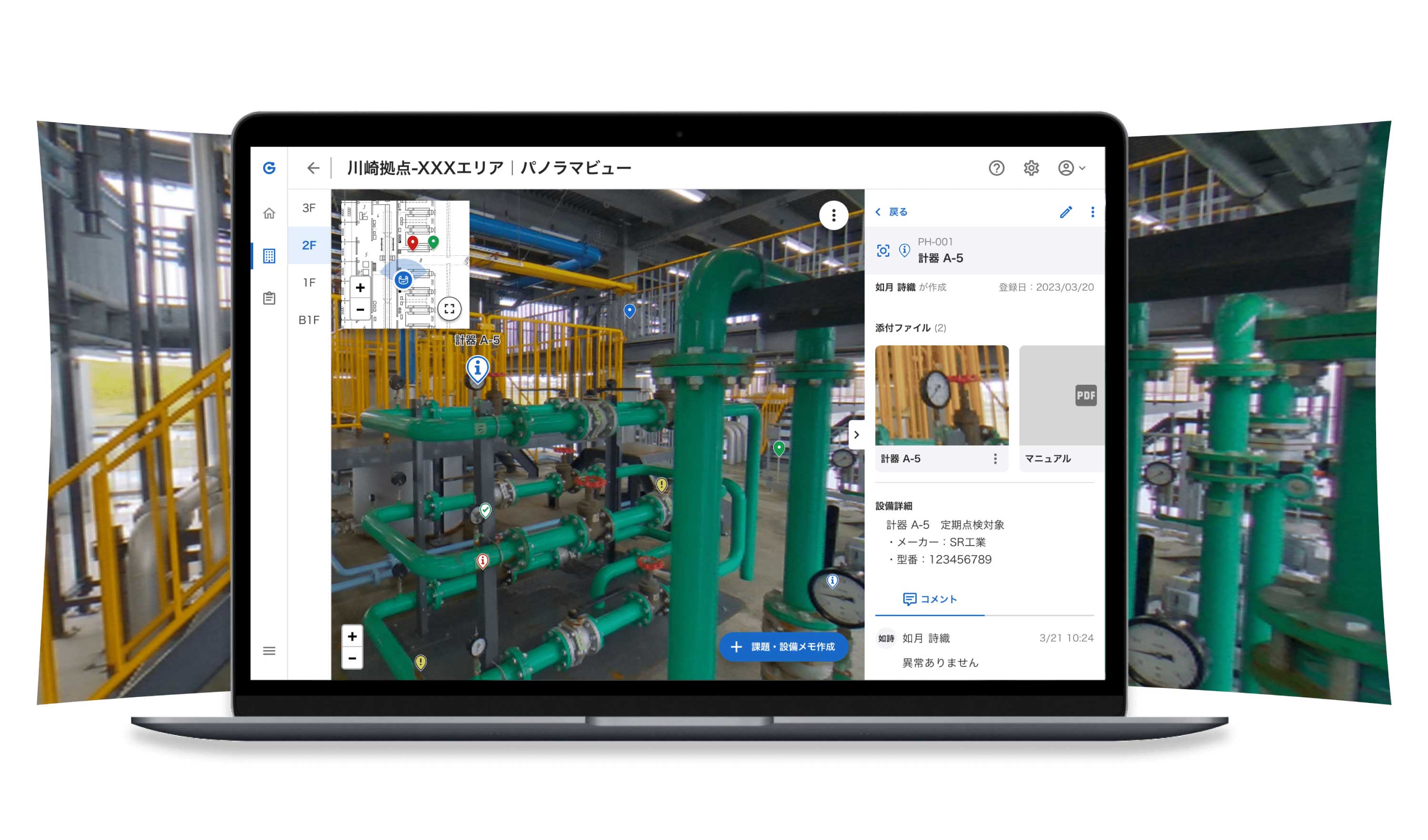 設備情報とトラブルやタスク管理を図面や360°パノラマ上で行うことができ、直感的に現場を把握することができます。